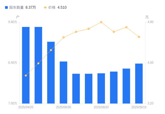 近一年(2024年9月30日至2025年9月19日),宝新能源A股股东户数从8.95万户,减低至8.37万户,降幅6.44%,区间股价上涨5.37%。