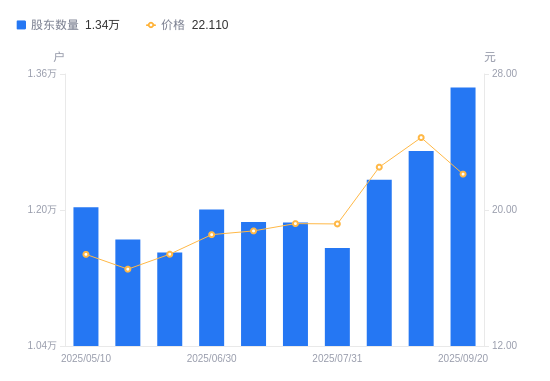 近一年(2024年9月20日至2025年9月20日),铭利达A股股东户数从1.11万户,增加至1.34万户,增幅21.37%,区间股价上涨61.39%。