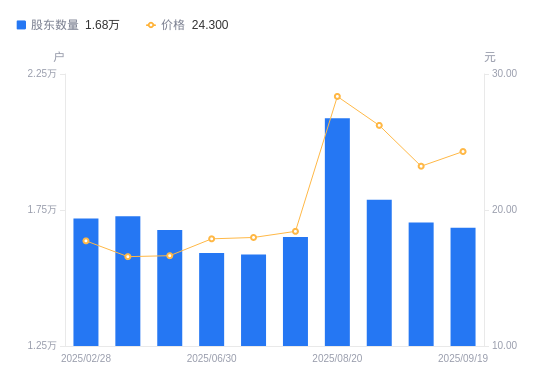 近一年(2024年9月30日至2025年9月19日),上海合晶A股股东户数从2.23万户,减低至1.68万户,降幅24.43%,区间股价上涨70.53%。