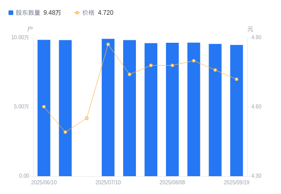 近一年(2024年9月10日至2025年9月10日),南玻AA股股东户数从10.94万户,减低至9.55万户,降幅12.74%,区间股价上涨0.61%。