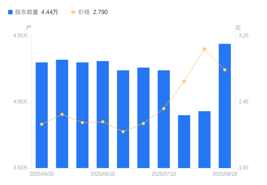 近一年(2024年9月30日至2025年9月19日),福星股份A股股东户数从5.04万户,减低至4.44万户,降幅11.83%,区间股价上涨10.28%。