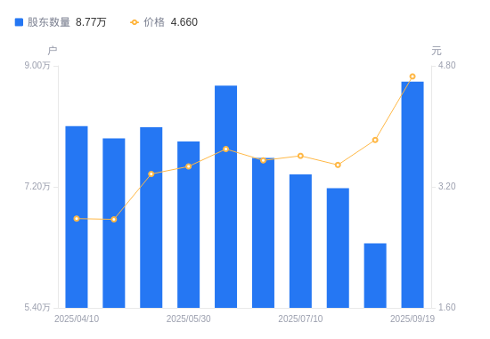 9月26日消息,数据显示,截至2025年7月10日,康盛股份A股股东总户数为7.38万户,较上期(2025年6月30日)减少2450户,降幅3.21%。公司最新A股总股本为11.36亿股,其中流通A股11.36亿股,户均持有流通A股数量为1.54万股,较上期增加494.2股,增幅3.32%;户均持流通A股市值5.56万元,较上期增加2677.77元,增幅5.06%。