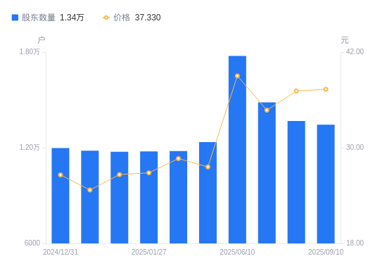 近一年(2024年9月20日至2025年9月10日),华研精机A股股东户数从1.33万户,增加至1.34万户,增幅0.74%,区间股价上涨70.77%。