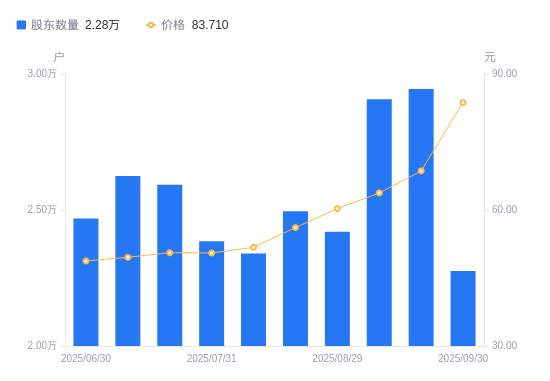 近一年(2024年9月30日至2025年9月30日),尚太科技A股股东户数从1.73万户,增加至2.28万户,增幅31.81%,区间股价上涨77.27%。
