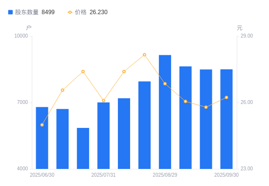 近一年(2024年9月30日至2025年9月30日),侨源股份A股股东户数从3597户,增加至8499户,增幅136.28%,区间股价下跌12.25%。