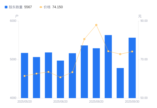 近一年(2024年9月30日至2025年9月30日),安杰思A股股东户数从5657户,减低至5567户,降幅1.59%,区间股价上涨35.99%。