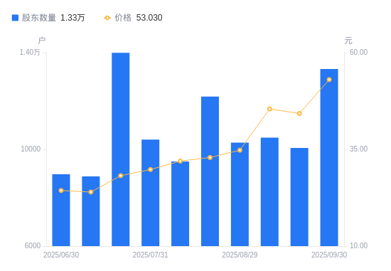 近一年(2024年9月30日至2025年9月30日),宏盛股份A股股东户数从9576户,增加至1.33万户,增幅39.13%,区间股价上涨263.97%。