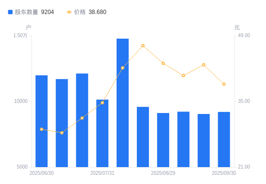 近一年(2024年9月30日至2025年9月30日),朗特智能A股股东户数从1.3万户,减低至9204户,降幅29.41%,区间股价上涨68.91%。