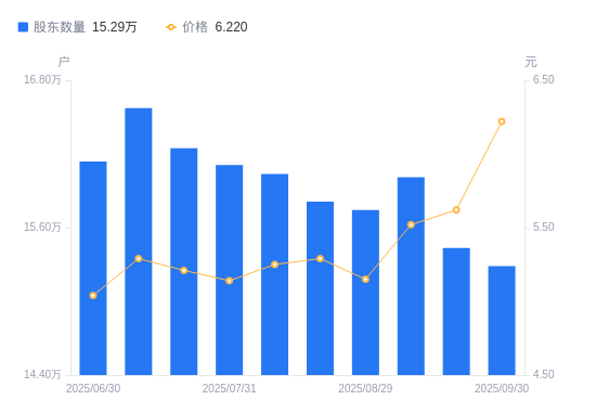 近一年(2024年9月30日至2025年9月30日),吉电股份A股股东户数从17.11万户,减低至15.29万户,降幅10.65%,区间股价上涨22.59%。