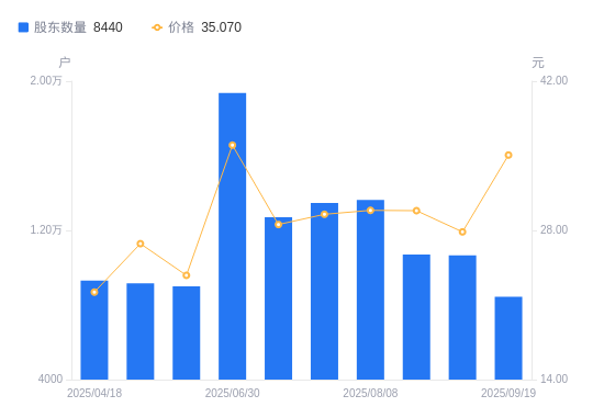 近一年(2024年9月30日至2025年9月19日),唯特偶A股股东户数从7058户,增加至8440户,增幅19.58%,区间股价上涨95.27%。