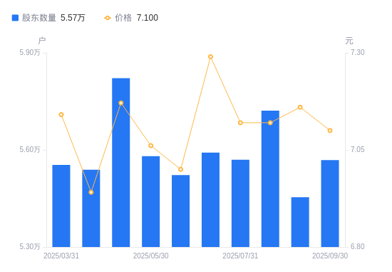 近一年(2024年9月30日至2025年9月30日),皖能电力A股股东户数从5.07万户,增加至5.57万户,增幅9.74%,区间股价下跌4.58%。