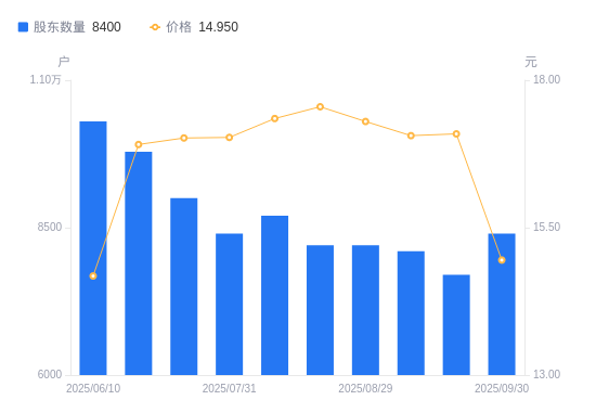 10月9日消息,数据显示,截至2025年9月30日,中胤时尚A股股东总户数为8400户,较上期(2025年9月19日)增加700户,增幅9.09%。公司最新A股总股本为2.4亿股,其中流通A股2.4亿股,户均持有流通A股数量为2.86万股,较上期减少2597.4股,降幅8.33%;户均持流通A股市值42.71万元,较上期减少10.55万元,降幅19.81%。