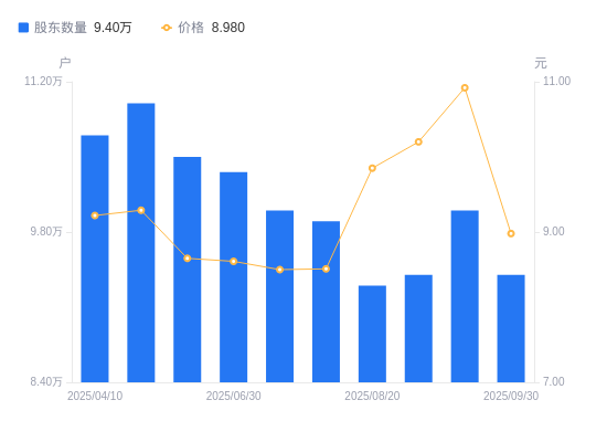 近一年(2024年9月30日至2025年9月30日),西安饮食A股股东户数从11.64万户,减低至9.4万户,降幅19.23%,区间股价上涨9.65%。