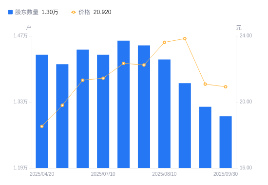 10月9日消息,数据显示,截至2025年9月30日,华是科技(维权)A股股东总户数为1.3万户,较上期(2025年9月20日)减少200户,降幅1.52%。公司最新A股总股本为1.14亿股,其中流通A股7006.88万股,户均持有流通A股数量为5389.91股,较上期增加81.67股,增幅1.54%;户均持流通A股市值11.28万元,较上期增加859.12元,增幅0.77%。