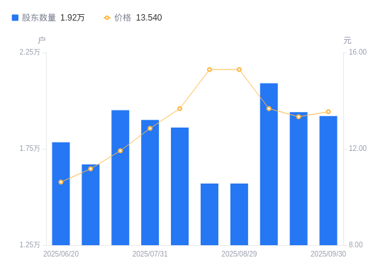 近一年(2024年9月30日至2025年9月30日),镇洋发展A股股东户数从2.05万户,减低至1.92万户,降幅6.46%,区间股价上涨70.64%。
