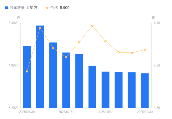 近一年(2024年9月30日至2025年9月30日),新联电子A股股东户数从4.89万户,减低至4.51万户,降幅7.76%,区间股价上涨76.65%。