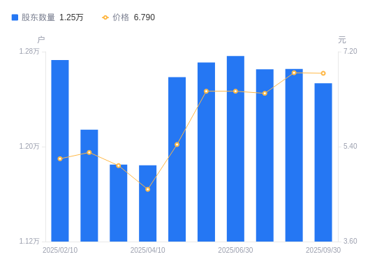 近一年(2024年9月30日至2025年9月30日),ST八菱A股股东户数从1.43万户,减低至1.25万户,降幅12.21%,区间股价上涨55.38%。