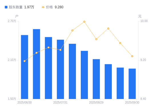 近一年(2024年9月30日至2025年9月30日),汇金通A股股东户数从1.7万户,增加至1.97万户,增幅15.96%,区间股价上涨27.25%。