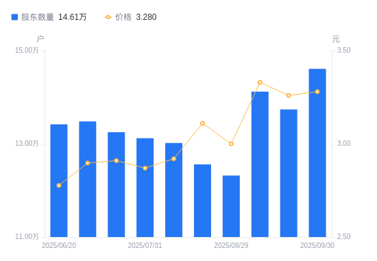 近一年(2024年9月30日至2025年9月30日),奥特佳A股股东户数从13.83万户,增加至14.61万户,增幅5.66%,区间股价上涨26.30%。