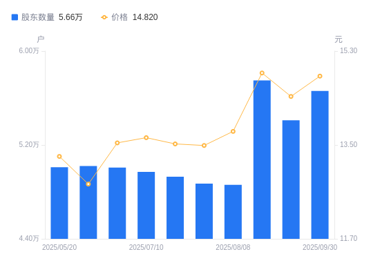 近一年(2024年9月30日至2025年9月30日),安洁科技A股股东户数从4.66万户,增加至5.66万户,增幅21.40%,区间股价下跌2.18%。