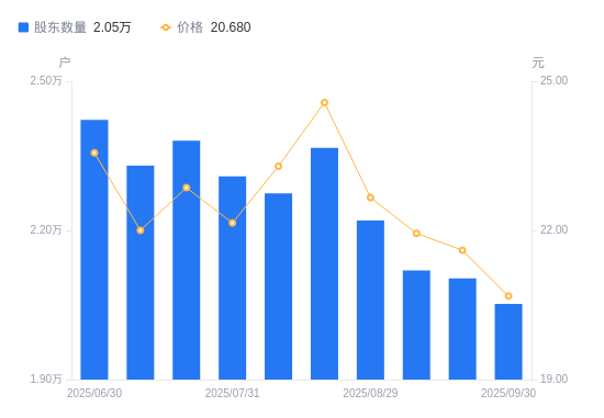 10月10日消息,数据显示,截至2025年9月30日,双飞集团A股股东总户数为2.05万户,较上期(2025年9月19日)减少515户,降幅2.45%。公司最新A股总股本为2.18亿股,其中流通A股1.25亿股,户均持有流通A股数量为6104.35股,较上期增加149.45股,增幅2.51%;户均持流通A股市值12.62万元,较上期减少2387.82元,降幅1.86%。
