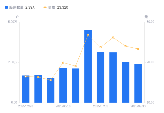 近一年(2024年9月30日至2025年9月30日),力生制药A股股东户数从1.87万户,增加至2.39万户,增幅27.83%,区间股价上涨45.37%。