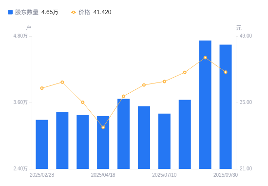 近一年(2024年9月30日至2025年9月30日),药石科技A股股东户数从3.24万户,增加至4.65万户,增幅43.53%,区间股价上涨32.62%。