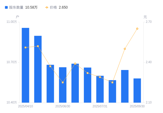 10月11日消息,数据显示,截至2025年9月30日,华侨城AA股股东总户数为10.58万户,较上期(2025年9月19日)减少627户,降幅0.59%。公司最新A股总股本为80.38亿股,其中流通A股68.99亿股,户均持有流通A股数量为6.52万股,较上期增加384.16股,增幅0.59%;户均持流通A股市值17.28万元,较上期增加1.07万元,增幅6.63%。
