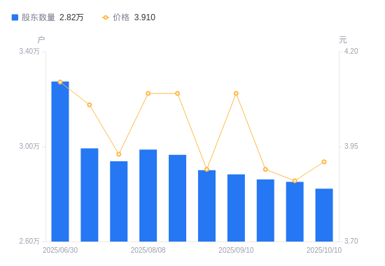 近一年(2024年10月10日至2025年10月10日),三木集团A股股东户数从3.02万户,减低至2.82万户,降幅6.64%,区间股价上涨23.73%。