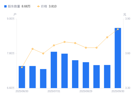 10月10日消息,数据显示,截至2025年9月30日,广东建工A股股东总户数为8.68万户,较上期(2025年9月19日)增加1.28万户,增幅17.34%。公司最新A股总股本为37.54亿股,其中流通A股15.63亿股,户均持有流通A股数量为1.8万股,较上期减少3119.88股,降幅14.77%;户均持流通A股市值6.86万元,较上期减少1.04万元,降幅13.18%。