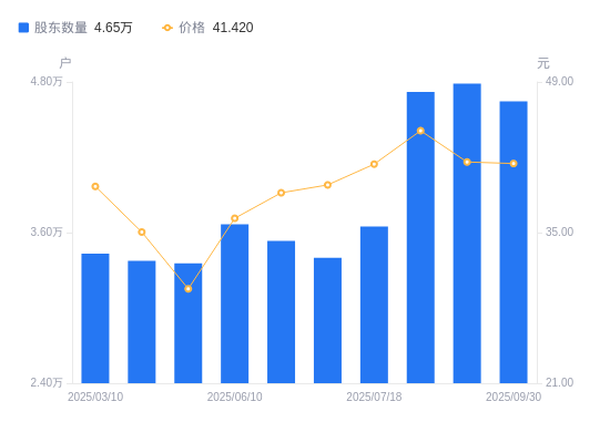 近一年(2024年9月30日至2025年9月19日),药石科技A股股东户数从3.24万户,增加至4.79万户,增幅47.88%,区间股价上涨33.07%。