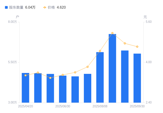 近一年(2024年9月20日至2025年9月19日),南方泵业A股股东户数从3.45万户,增加至6.23万户,增幅80.76%,区间股价上涨110.18%。