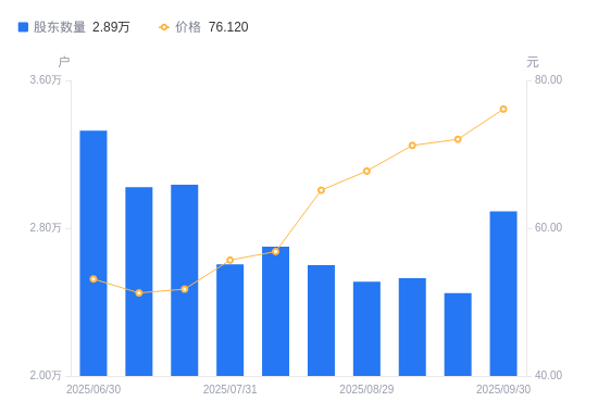 近一年(2024年9月30日至2025年9月30日),腾远钴业A股股东户数从2.92万户,减低至2.89万户,降幅1.15%,区间股价上涨75.63%。