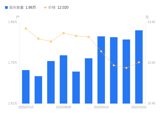 近一年(2024年10月10日至2025年10月10日),中原传媒A股股东户数从2.76万户,减低至1.86万户,降幅32.52%,区间股价上涨9.97%。