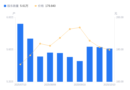 近一年(2024年10月10日至2025年10月10日),爱美客A股股东户数从6.01万户,减低至5.61万户,降幅6.62%,区间股价下跌20.33%。