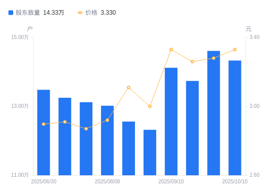 近一年(2024年10月10日至2025年10月10日),奥特佳A股股东户数从13.52万户,增加至14.33万户,增幅5.99%,区间股价上涨23.93%。