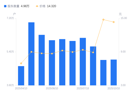 近一年(2024年10月10日至2025年10月10日),宁波东力A股股东户数从4.19万户,增加至4.98万户,增幅19.03%,区间股价上涨220.36%。