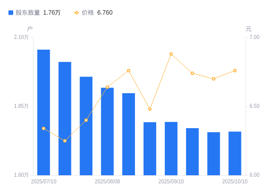 近一年(2024年10月10日至2025年10月10日),龙利得A股股东户数从1.96万户,减低至1.76万户,降幅10.18%,区间股价上涨37.96%。