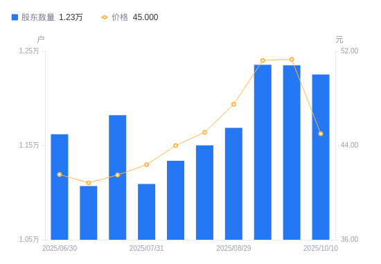 近一年(2024年11月20日至2025年10月10日),金杨股份A股股东户数从1.23万户,减低至1.23万户,降幅0.62%,区间股价上涨83.32%。