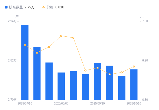 10月13日消息,数据显示,截至2025年9月10日,摩恩电气A股股东总户数为2.81万户,较上期(2025年8月29日)增加337户,增幅1.21%。公司最新A股总股本为4.41亿股,其中流通A股4.39亿股,户均持有流通A股数量为1.56万股,较上期减少189.29股,降幅1.20%;户均持流通A股市值10.6万元,较上期减少653.28元,降幅0.61%。
