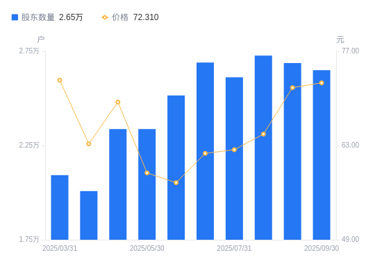 近一年(2024年9月30日至2025年9月30日),丰立智能A股股东户数从2.19万户,增加至2.65万户,增幅20.95%,区间股价上涨85.73%。