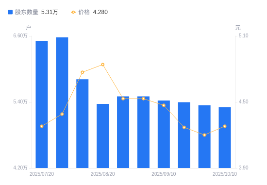 近一年(2024年10月10日至2025年10月10日),悦心健康A股股东户数从5.7万户,减低至5.31万户,降幅6.89%,区间股价上涨22.99%。