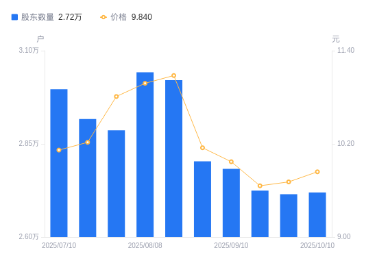 近一年(2024年10月10日至2025年10月10日),陇神戎发A股股东户数从3.1万户,减低至2.72万户,降幅12.24%,区间股价上涨7.31%。