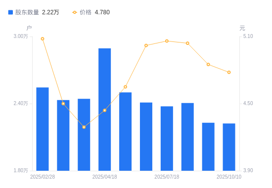 近一年(2024年10月10日至2025年10月10日),安居宝A股股东户数从2.62万户,减低至2.22万户,降幅15.18%,区间股价下跌1.24%。