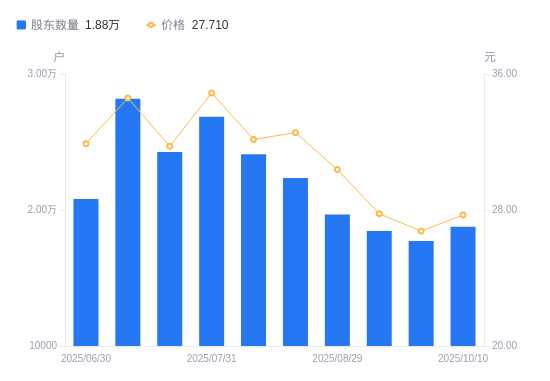 近一年(2024年10月10日至2025年10月10日),邵阳液压A股股东户数从1.28万户,增加至1.88万户,增幅46.96%,区间股价上涨75.39%。