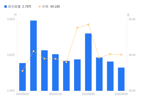 近一年(2024年9月30日至2025年9月30日),中天火箭A股股东户数从2.19万户,增加至2.79万户,增幅27.46%,区间股价上涨24.85%。