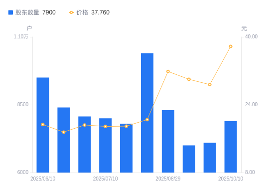 近一年(2024年10月10日至2025年10月10日),嘉亨家化A股股东户数从6700户,增加至7900户,增幅17.91%,区间股价上涨183.48%。