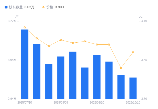 近一年(2024年9月30日至2025年9月30日),亚厦股份A股股东户数从3.23万户,减低至3.03万户,降幅6.22%,区间股价上涨7.28%。