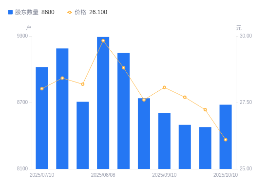 近一年(2024年10月10日至2025年10月10日),交大思诺A股股东户数从1.02万户,减低至8680户,降幅14.67%,区间股价下跌12.77%。