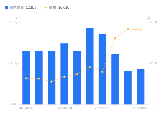 近一年(2024年10月10日至2025年10月10日),康普顿A股股东户数从1.7万户,减低至1.18万户,降幅30.59%,区间股价上涨109.19%。